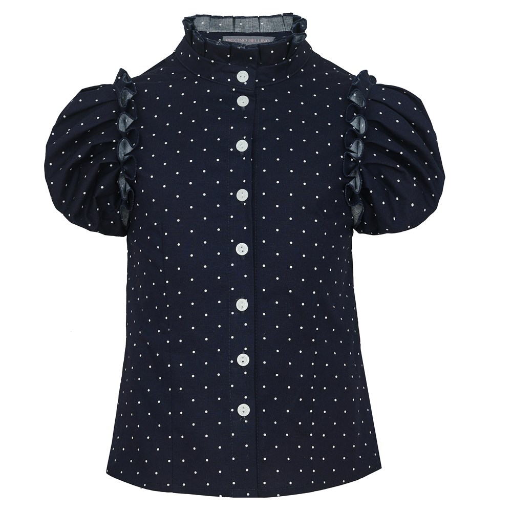 Сшита из 100% хлопка, блузка обеспечивает воздухопроницаемость и комфорт в течение всего дня. Блузка уникального дизайна синяя в белый горошек с пышными короткими рукавами подойдет как для школы, так и для повседневной носки. Пуговицы добавляют блузке очаровательный акцент. Эта модель станет отличным вариантом для школьных будней, прогулок с друзьями и даже для торжественных мероприятий, таких как выпускной.