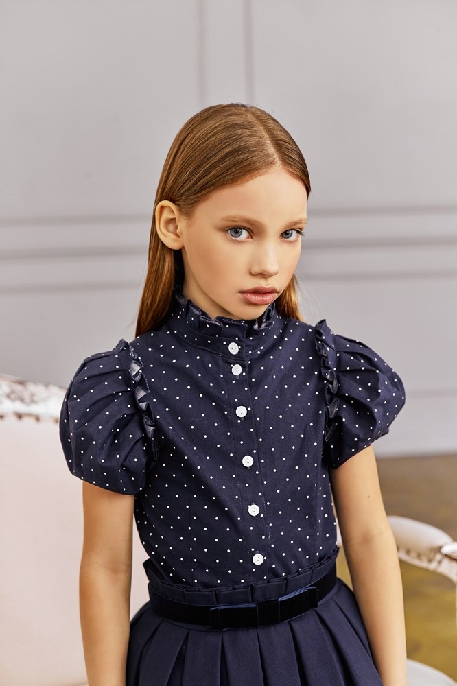 Сшита из 100% хлопка, блузка обеспечивает воздухопроницаемость и комфорт в течение всего дня. Блузка уникального дизайна синяя в белый горошек с пышными короткими рукавами подойдет как для школы, так и для повседневной носки. Пуговицы добавляют блузке очаровательный акцент. Эта модель станет отличным вариантом для школьных будней, прогулок с друзьями и даже для торжественных мероприятий, таких как выпускной.